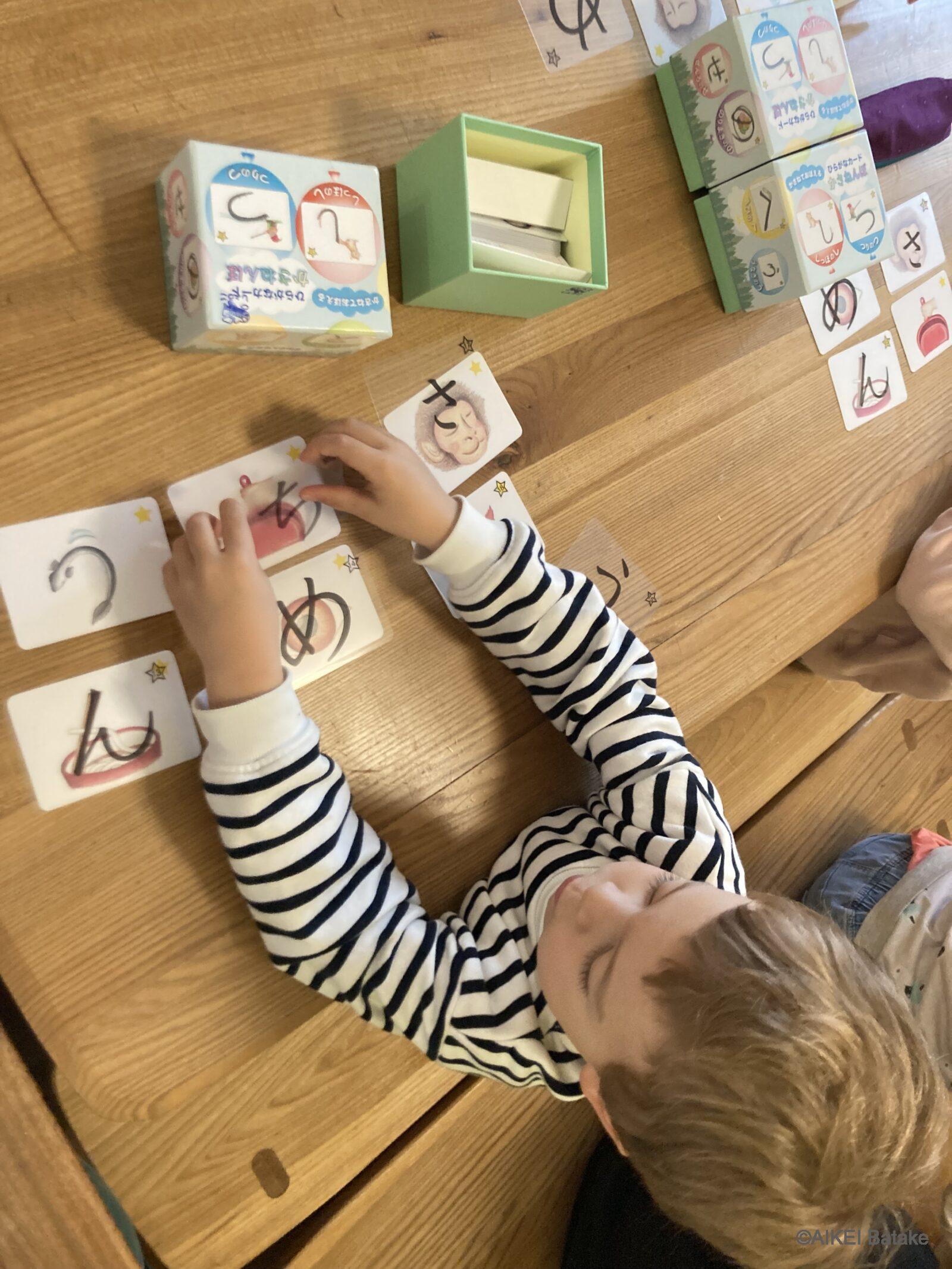 音と文字の形をつなげて覚える絵カードに文字カードをかさねると…